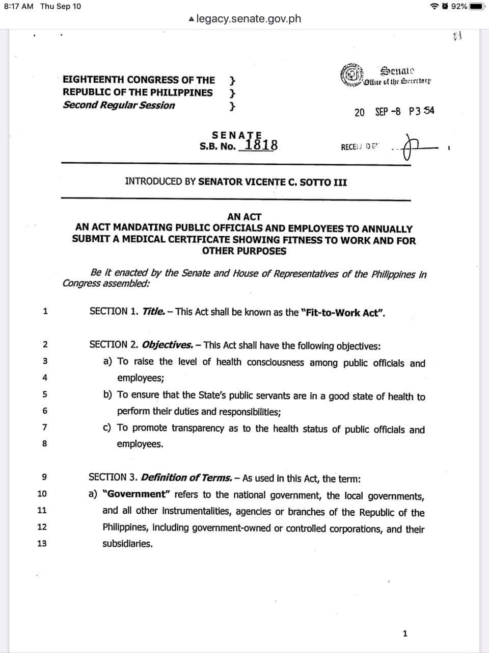 One News Ph On Twitter Senate Pres Sotto Tito Iii Files A Bill Called Fit To Work Act That Seeks To Mandate Public Officials And Employees To Submit A Medical Certificate Annually To Ensure That
